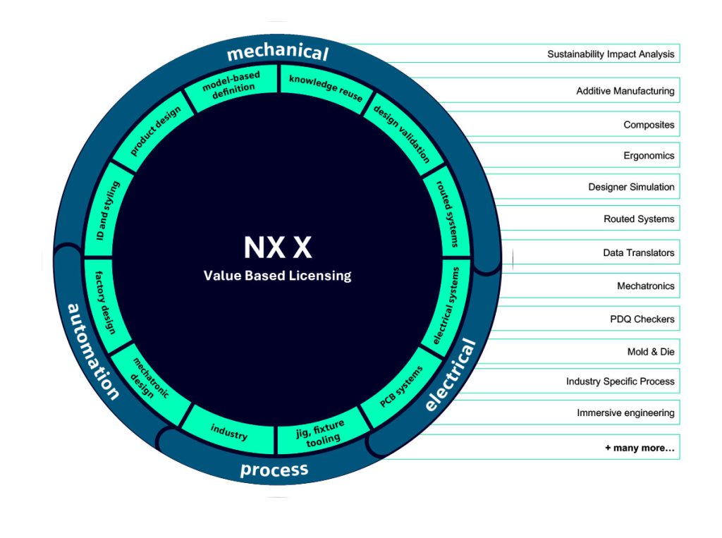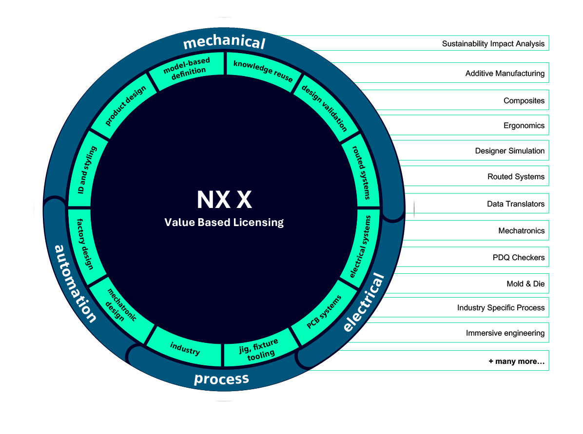 การอนุญาตใช้งานแบบ VALUE BASE LICENSING ใน NX เป็นวิธีการที่ยืดหยุ่นและคุ้มค่าอย่างยิ่งในการเข้าถึงโมดูลเสริม NX ที่หลากหลาย ด้วยผลิตภัณฑ์มากกว่า 110 รายการที่มีอยู่ในกลุ่มโทเค็น คุณจึงมีอิสระในการปรับแต่งเวิร์กโฟลว์ของคุณด้วยความยืดหยุ่นเป็นพิเศษ คุณใช้จำนวนโทเค็นสำหรับฟีเจอร์ที่คุณใช้เท่านั้น ช่วยลดความจำเป็นในการซื้อแต่ละผลิตภัณฑ์แยกต่างหาก ซึ่งเป็นประโยชน์อย่างยิ่งสำหรับการเข้าถึงเครื่องมือที่ใช้เป็นครั้งคราว ช่วยให้คุณใช้งานได้ตามต้องการโดยไม่ต้องลงทุนเพิ่มเติม